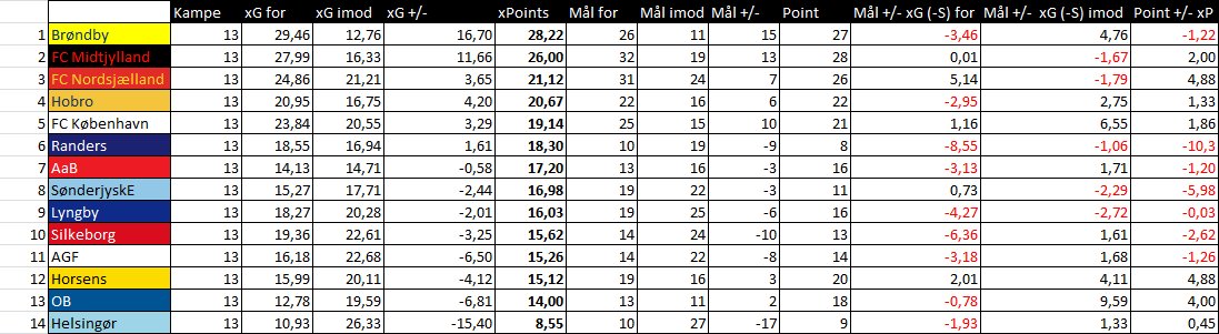 Hvis jeg forstår dig rigtigt - så underpræsterede OB i sidste efterår ud fra udregningsmetoden, nu overpræsterer de. Nu kunne jeg godt tænke mig at vide, hvad man kan bruge denne beregningsmetode til. Det lyder generelt på dig som om at man underpræsterer, fordi man er dårlig til at forvalte sit materiale og når man overpræsterer, så er man heldig. Du må i øvrigt gerne lige forklare de forskellige overskrifter i skemaet, da jeg ikke umiddelbart kan gætte mig til hvad de alle betyder. Burde OB have 14 point og de har 18 efter runde 13 og er det beregnet ud fra antal afslutninger for og imod, hvor OB er i 6,88 negativ?